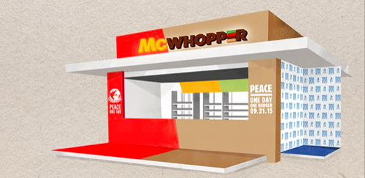 In a full-page ad in Wednesday's New York Times and Chicago Tribune, Restaurant Brands International (QSR +1.69%) proposed that its Burger King chain and its Golden Arches foe create a pop-up restaurant midway between the two companies' corporate headquarters and sell "McWhoppers," with all proceeds going to the charity Peace One Day, a nonprofit that promotes the U.N.'s International Day of Peace that occurs on Sept. 21. It even created a website, McWhopper.com, to explain the idea.