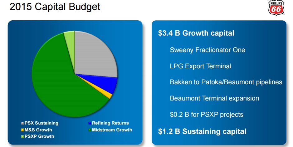 The refining giant is in the process of diversifying its business and is increasingly focused on expanding its midstream assets. In fact, most of its 2015 capital budget prioritizes these kinds of projects. That's because, thanks to their fixed-fee, long-term contracts of between five and 23 years in duration, they provide steady and predictable cash flow with which to reward Phillips 66 investors with ongoing buybacks and dividend growth.