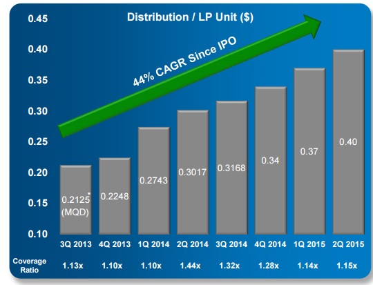 Thanks to the enormous amount of dropdowns Phillips 66 is planning, as well as organic growth investments the MLP is currently working on, management believes it can grow the distribution by a 30% compound annual growth rate while still maintaining a sustainable 1.1 distribution coverage ratio.