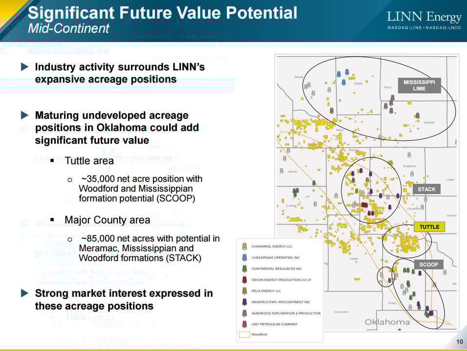 The company holds approximately 35,000 net acres in the Tuttle area in Oklahoma, with Woodford and Mississippian formation, or SCOOP potential, and we anticipate drilling a horizontal well to evaluate the potential of this acreage position in the fourth quarter of 2015. LINN also holds 85,000 net acres in the Major County area of Oklahoma which we believe to be prospective for multiple horizontal targets including the Meramac, Mississippian and Woodford formations, otherwise known as STACK. Over the next 18 months, we anticipate spending modest amounts of capital to analyze these significant highly prospective acreage positions. We expect strong market interest in a potential trade or sale of these assets, and believe these positions represent a tremendous amount of potential future value.