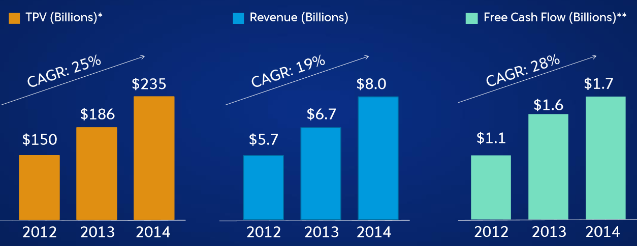 PayPal has grown tremendously in recent years, adding 19 million active users last year alone and producing outstanding grown in payments volume (57% since 2012), revenue (40%), and free cash flow (55%). And, the company has gone on a "shopping spree lately," acquiring smaller competitors with valuable technologies and relationships such as Xoom and Paydiant.