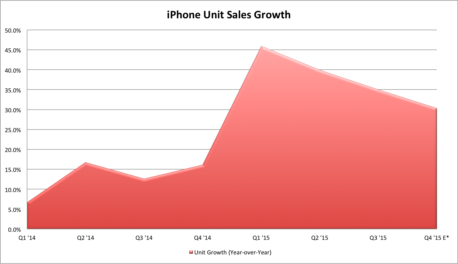 Current estimates call for Apple iPhone shipments to hover somewhere around 50 million in the quarter. A recent sell-side note from UBS estimates 49 million iPhone shipments for Apple's fiscal-year fourth-quarter 2015, although its historic fourth-quarter performances suggest shipment volume north of 51 million iPhones sold. Most critically, either number would still represent significant year-over-year shipment growth for Apple coming at a time when concerns over the longevity of its current iPhone "super cycle" have weighed on its stock price.