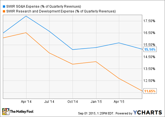 But expense controls can also be a cause for concern for any turnaround. They are especially worrisome for a company that's focused on riding an emerging technology wave. SG&A and R&D expenses as a percentage of revenue have fallen markedly in the past few years, though they are by no means low. Still, you have to wonder if this trend will end up becoming drag on the company's future prospects. That doesn't seem to be happening yet, but there's typically a lag between underinvestment and its negative impact on revenue growth.