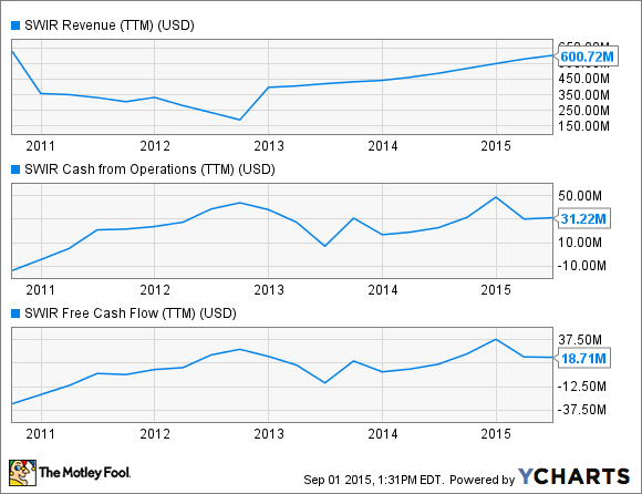 Some of the first quarter decline was probably due to normal seasonality. That said, revenue growth at Sierra Wireless hasn't generated meaningful improvement in operating or free cash flow. Importantly, it's free cash flow that funds growth. If a company can't fund growth from those cash flows, it needs to issue stock and bonds or sell underperforming operations to grow. Tapping the market can act as a drag on earnings per share, since there are more shares to split the earnings or rising interest expenses. Moreover, it's unlikely an IoT pure play has operations that it would make sense to sell.