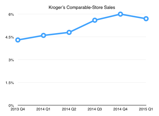 Despite the first-quarter profit beat, Kroger in June left its 2015 earnings guidance unchanged. Profit is still expected to rise by about 12% to $3.85 per share. But that conservatism has more to do with falling gasoline margins than any soft retailing results. That's clear from the fact that Kroger boosted its sales growth outlook for the year by 0.5 percentage points (comps are now forecast to hit 4% for 2015). Yet despite those improving business trends, the stock has fallen 14% from the all-time high it hit just before last month's market carnage.