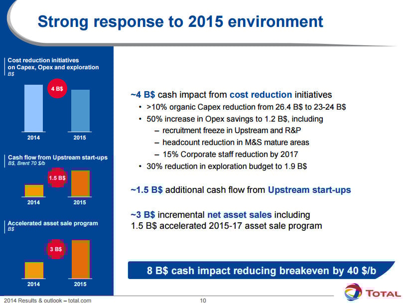 In response to the oil market downturn, Total has taken a number of actions to reduce its expenses as well as boost its cash position. As the following slide notes, the company has put together a plan that has a cash impact value of $8 billion.