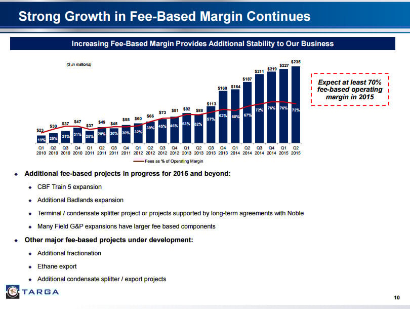 Because of this, investors should seek MLPs that derive most of their income from fee-based assets because this provides stability. A good example of this is Targa Resources Partners (NYSE: NGLS), which continues to steadily grow its fee-based income as we can see on the slide below.
