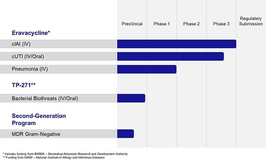 So what: The company announced that its Phase 3 IGNITE2 clinical trail, which was testing its flagship drug eravacycline's ability to treat complicated urinary tract infections, failed to meet its primary endpoint. The study showed that the experimental antibiotic failed to show show statistically significant non-inferiority when compared to levofloxacin, a currently available generic antibiotic.