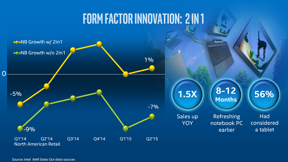 Skaugen made a pretty convincing argument that Intel's push to converge tablets and notebooks with 2-in-1 devices has been successful, with the key points visible in the following slide: