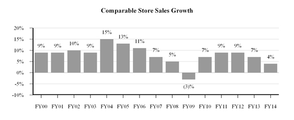 In 2014, comparable store sales fell to some of their lowest levels. Management outlook for fiscal 2015 has comparable store sales continuing to grow in the low to mid-single digits as the company moves forward with its turnaround plans.