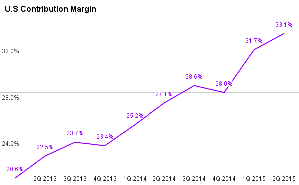 Contribution margin rose to 33.1% of revenue in the U.S during the second quarter. Management has a long-term target of achieving a contribution margin of 40% in the U.S. by 2020, and it believes things are running ahead of plan because of higher than anticipated revenue growth and moderate increases in content and other streaming costs.