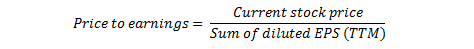3. Price-to-earnings (P/E): This is probably the most oft-quoted valuation metric in investing, and for good reason. The P/E is a relative valuation metric, meaning it's useful for comparing a company's valuation relative to its peers as well as to its own history, since it's based on the current stock price. Keeping with our Wal-Mart example, the company currently has a P/E (based on TTM earnings) of 13.4. In January of this year, the ratio was 17.5. In other words, this lets us see how much cheaper Wal-Mart is now than it was just a few months ago thanks to the market correction and the company's disappointing earnings report this past quarter.