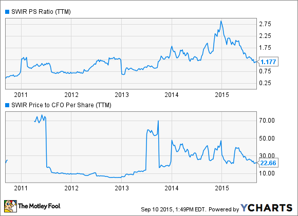 Methods for valuing a stock with negative earnings can also include price-to-sales or price-to-cash flow from operations ratios. Evaluating Sierra Wireless with the alternative valuation methods, the stock trades at 1.2 times sales. While that's down from recent highs, the following chart shows it's still near the top of the range it was trading in before hype about the Internet of Things set in.