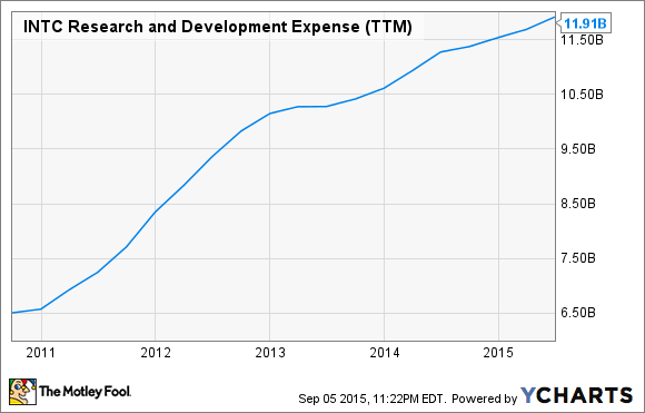 The typical design cycle for a processor is around four to five years, which means that the processors that we're seeing hit the market today began development many years ago. If we look at Intel's research and development spending, it's clear that the company has substantially ratcheted up its spending on the development of new products and technologies: