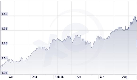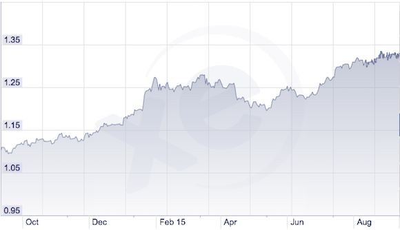 If you look at how U.S. dollar has strengthened in these markets over the past year, the increases are not surprising as Apple needs to preserve its revenue after being converted to U.S. dollars. For example, here is the U.S. dollar versus the Canadian dollar.