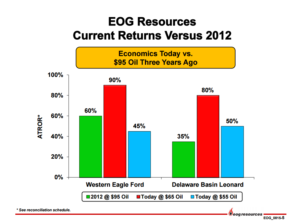 Just take a look at this graphic from EOG Resources, which is generating the same levels of returns on a barrel of oil at $55 as back in 2012 when oil prices were $95.
