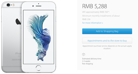 As first spotted by Re/code, shipping times for all models in China have quickly slipped. iPhone 6s orders are now quoting two- to three-week shipping, with 6s Plus orders showing three- to four-week shipping.