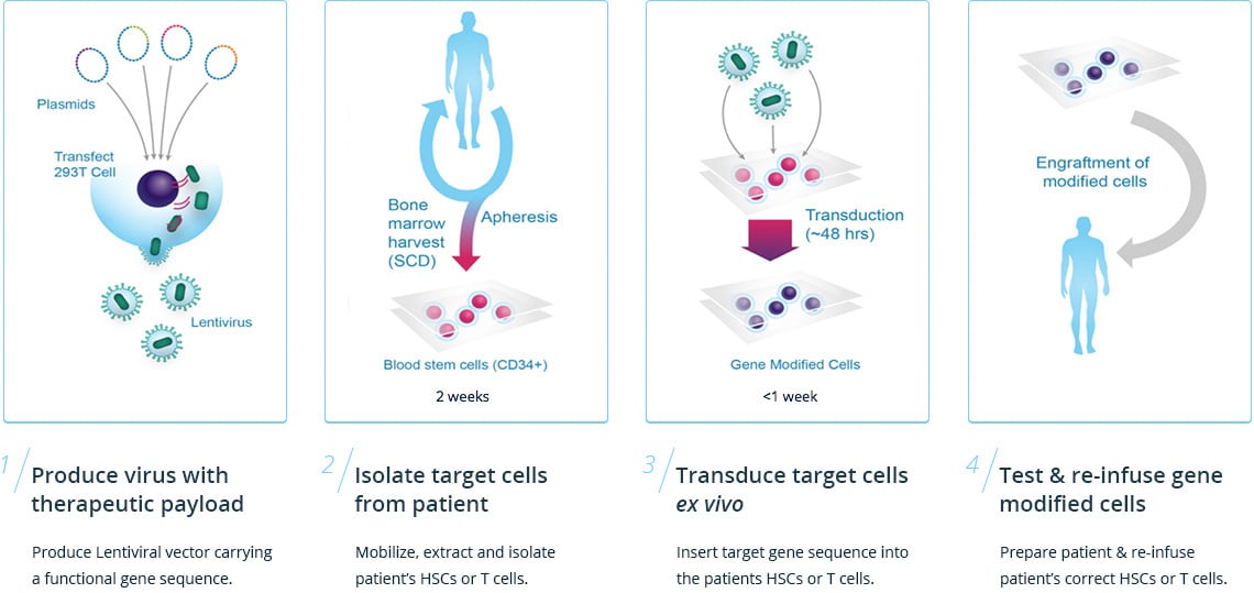 bluebird bio's lead product, LentiGlobin BB305, is a gene therapy which adds a functioning copy of the hemoglobin gene in patients that have deficiencies or abnormalities. Cells are removed from a patient, the gene is added with a viral vector in the lab, and then the cells are added back to the patient, avoiding the transplant rejection seen when patients are transplanted with other people's cells.