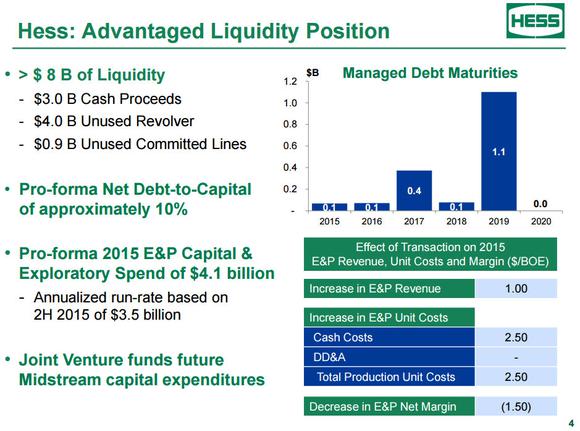With the closing of its midstream joint venture, Hess received $3 billion in cash. With that cash added to its balance sheet, Hess now has one of the strongest balance sheets in the energy sector. As the following slide notes, it has a boatload of liquidity and very little leverage.