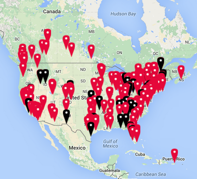 Red: Lululemon stores. Black: Lululemon showrooms. Source: Lululemon Athletica.