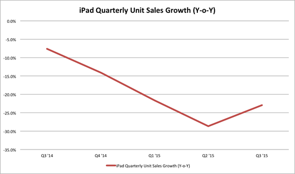 And although the two sales verticals certainly differ, the IBM deal alone appears to have had little affect on Apple's tablet business, barring an unlikely and significant decline in consumer tablet sales. In the five quarterly reports since Apple and IBM announced their partnerships, iPad sales have steadily contracted at an average rate of -19% year over year.