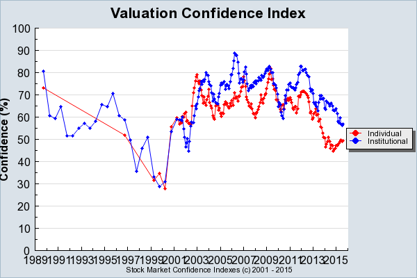 However, Shiller also constructs sentiment indexes, including a Valuation Confidence Index that tracks whether institutional and individual investors believe the market is overvalued, undervalued, or fairly valued. The current combination of that index and the CAPE is reminiscent of a disturbing historical precedent: