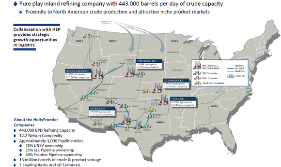 More importantly, HollyFrontier owns a 39% interest in its own master limited partnership, Holly Energy Partners (HEP +0.00%) that includes its 2% general partner interest. Through the MLP, the refiner owns logistical assets that include pipelines, storage terminals, and truck-loading racks. These assets are what make it easier for the five refineries to access cost-advantaged crude oil right from the well-head.