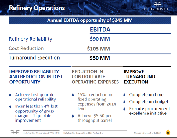 In addition, HollyFrontier is aiming to shave off 15% in fixed operating expenses from 2014 levels. Management thinks this should bring down overall operating expenses to $5.50 per throughput barrel.