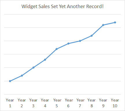 These two charts show the same data. The one on the left has a Y-axis that starts at zero and shows that widget sales have been essentially flat for the past 10 years. The one on the right, which cuts off a big chunk of the bottom and top of the graph, shows what appears to be a healthy rise in widget sales. Of course, since I've labeled the Y-axes, it's clear that the increase as a percentage is tiny. But if I remove the Y-axis labels, the chart on the right creates the illusion of robust sales growth: