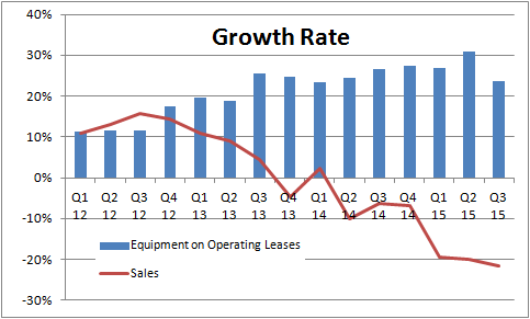 Second, the company has been increasing the amount of equipment it leases to farmers -- who may be holding out on outright purchases of equipment due to a fall in cash receipts -- and the subsequent creation of a glut of used equipment.
