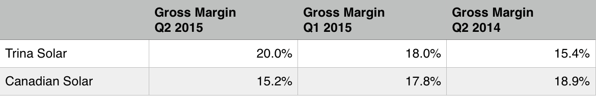 The good news for Trina Solar continues all the way down to the bottom line. Reporting net income of $43.1 million in the second quarter, an improvement of 318% year over year. Conversely, Canadian Solar has seen its profitability suffer greatly over the past year. For the second quarter, the company reported net income of $17.9 million -- a 68% decline from the $55.8 million it reported in the second quarter of 2014.