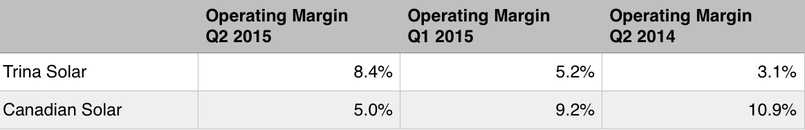 Examining the companies' operating margins, one finds a similar story. Trina has proved the ability to consistently improve over the past year. In doing so, it reported operating income of $60.7 million for the second quarter of 2015 -- a 286.5% improvement over the $15.7 million that it reported in second quarter of 2014. Canadian Solar, on the other hand, has consistently declined over the past year to keep its operating costs in check.