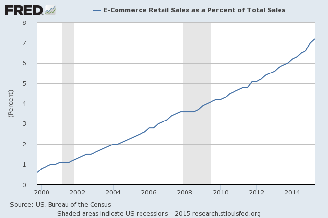 As selling moves online, Costco (NASDAQ: COST) is one of the few bricks-and-mortar companies that haven't been smacked by the fundamental retailing shift. In fact, the warehouse giant's customer traffic has been climbing at a market-thumping 4% annual rate for the last six years. That's amazing considering that e-commerce has surged from below 4% of retail sales to over 7% over that time. Shoppers may be buying more and more stuff online, but that hasn't caused them to skimp on their weekly Costco runs.