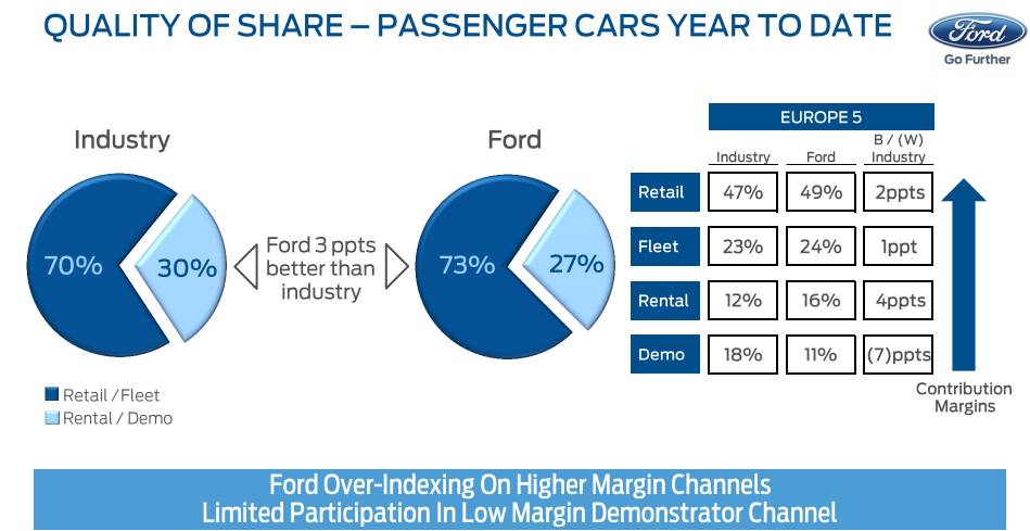 Ford has also made strategic decisions, albeit tough ones, to improve costs and manufacturing capacity; for example, it closed its long-standing Belgium plant. Also, beyond controlling its costs, Ford has focused on improving which business channels it sells its vehicles to, delivering more units to healthier retail and fleet channels rather than lower-margin rental and demonstrator channels.