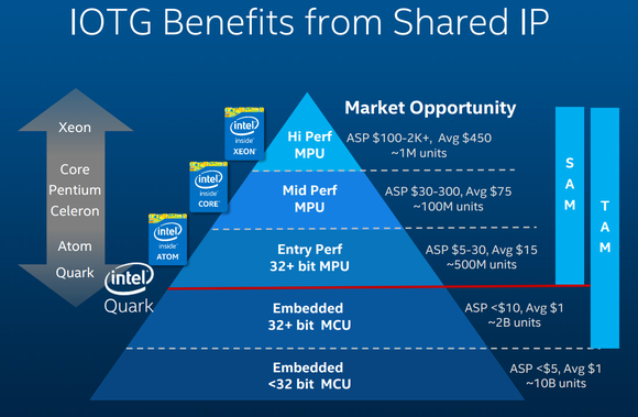Although low-performance/power micro-controllers make up the majority of the unit total addressable market within the Internet of Things (and the slide indicates that Intel has no plans to play in the $10 billion sub-32 bit microcontroller market), there seems to be plenty of high margin/average selling price business.