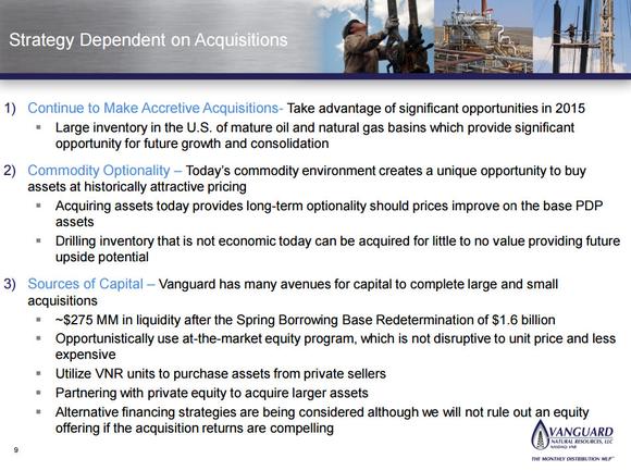Vanguard has a strong history of making acquisitions having completed $4.2 billion in deals since going public in 2008. Further, it is in the process of acquiring Eagle Rock Energy Partners and another MLP. However, acquisitions are tough to predict, meaning it has little visibility into future growth.