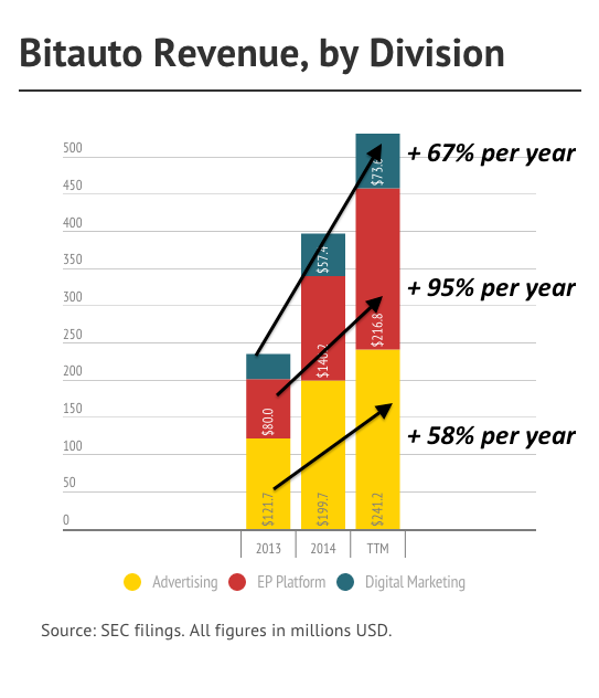 - Advertising: The company operates Bitauto.com for new-car buyers and Taoche.com for used-car buyers, extracting revenue from the listings and advertisements on these pages.