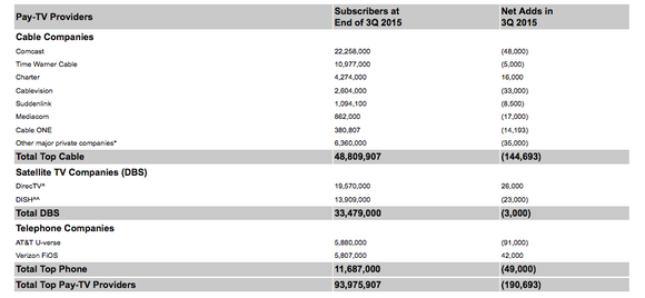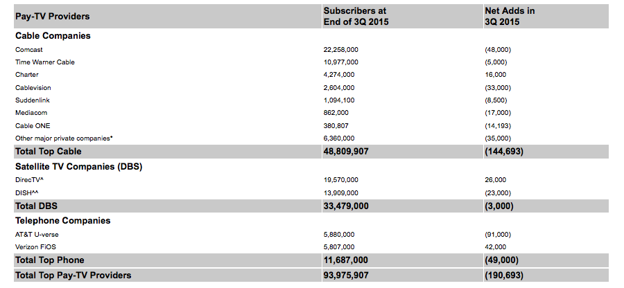 In the second quarter of 2015, the 13 largest pay-TV providers in the United States -- representing about 95% of the market -- lost about 470,000 net video subscribers compared to a loss of about 305,000 video subscribers the same quarter the previous year, according to Leichtman Research Group (LRG). That left the top pay-TV providers with 94.9 million subscribers and it followed a first quarter where the industry actually gained 10,000 customers.