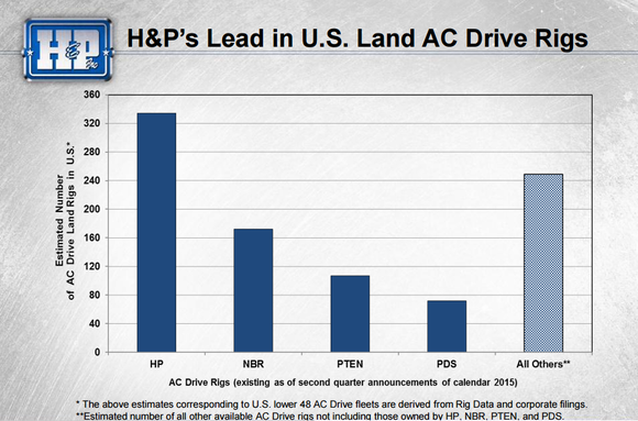 Helmerich & Payne operates in one of the less-talked-about sectors in the industry; it owns and leases land rigs to producers and oil services companies. However, the rigs that H&P owns are part of the reason that America's oil boom has been possible. The company has by far the largest fleet of AC-powered rigs that are capable of performing the work necessary for tapping shale wells.