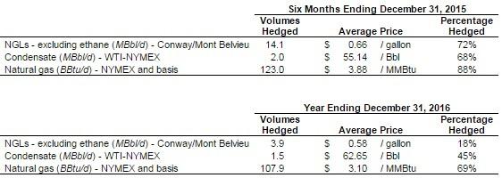 The same is true for its NGL segment, where three of its five businesses are either based on sales of NGLs or price differentials between major NGL hubs such as Conway, Kan., and Mont Belvieu, Texas. Some of these differentials are down by as much as 87% year over year for the first half of 2015.