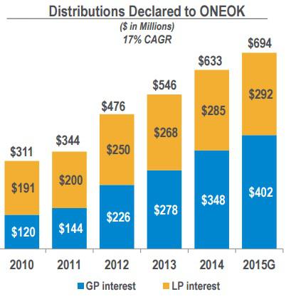 In fact, because of ONEOK's large equity stake and IDRs, 70% of every dollar of marginal adjusted EBITDA from ONEOK Partners flows back to its GP as distributions of one form or another, payments that have been growing at an impressive rate over the past five years.