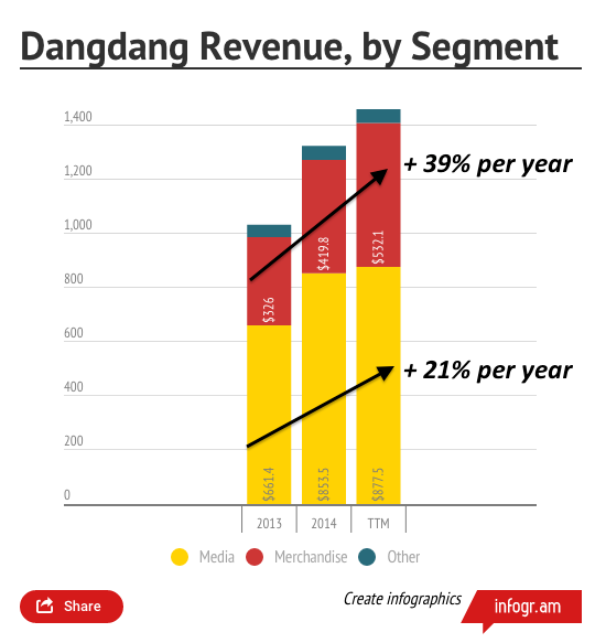 As with Amazon, Dangdang started out as a bookseller and has continuously moved toward hawking merchandise via the Internet. The company hopes to differentiate itself from JD.com and Tmall by focusing squarely on mid to high-end customers. Over time, this has meant more focus on merchandise over media. As you can see, the company has done an excellent job increasing sales in this division during the last 18 months.