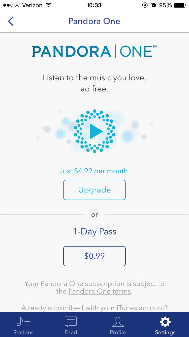 But for a weekend pool party or barbecue, spending $0.99 for a day of ad-free listening is extremely convenient, and it's something the average music listener would consider. Additionally, the lack of a subscription (that users might have to cancel) reduces hesitation in the purchase.