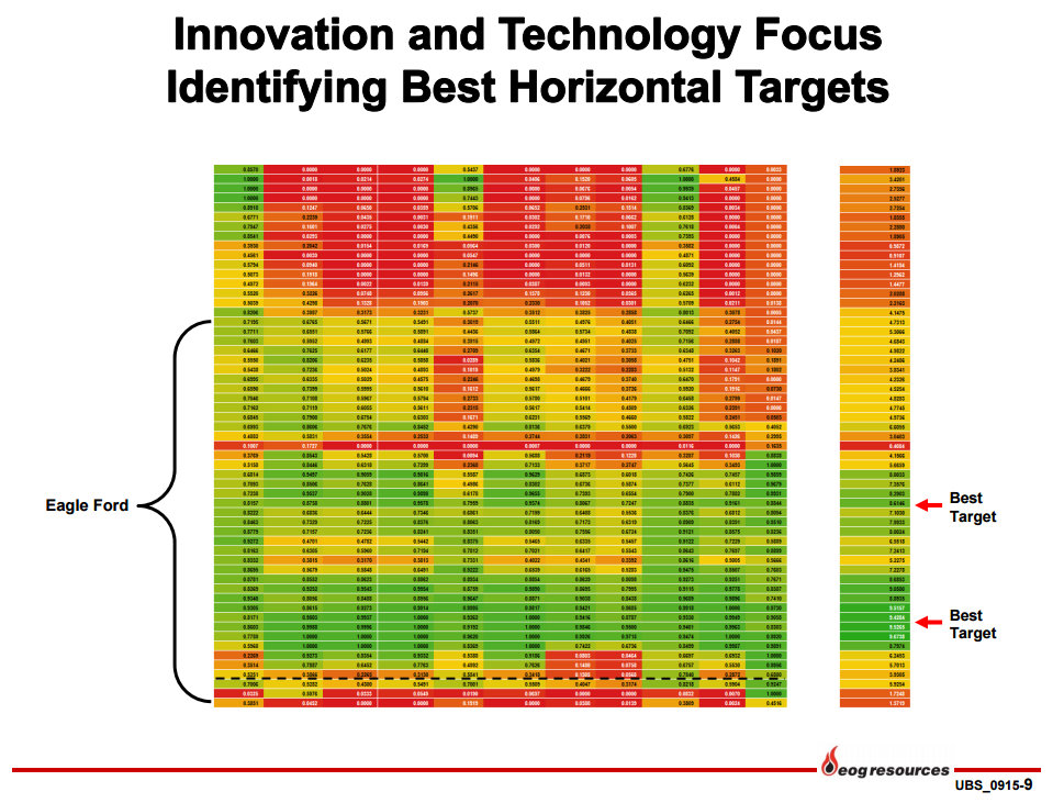 As the slide below shows, EOG Resources puts together heat map, so to speak, of where the best hydrocarbon-bearing rocks lie and then targets those sweet spots.