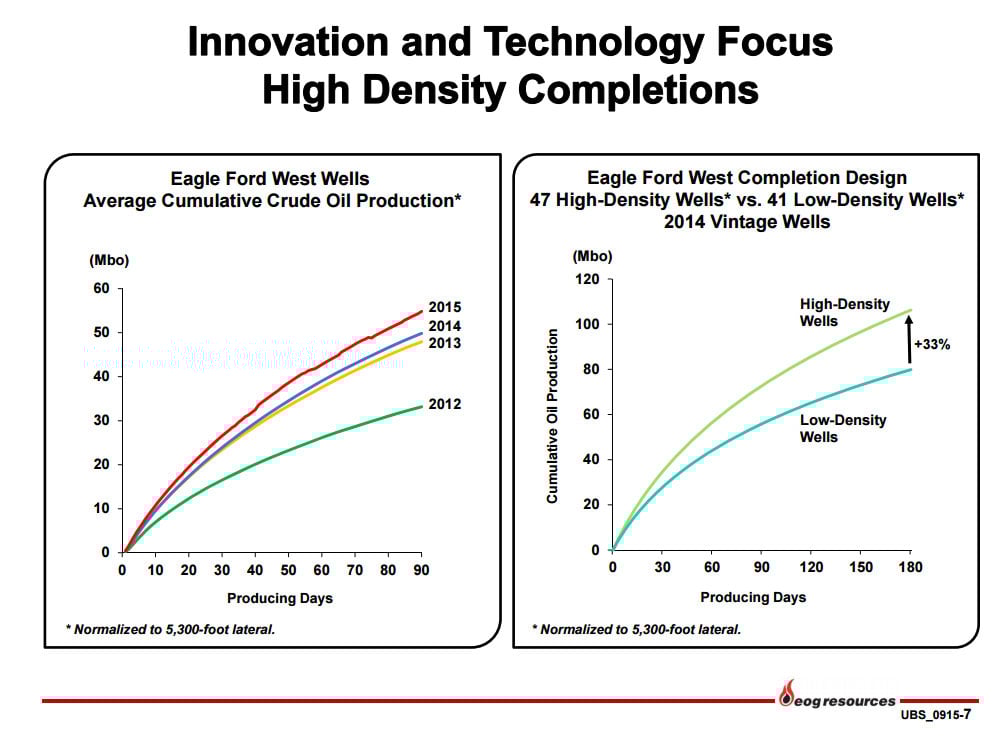 As that chart on the right shows, its high-density wells have shown a 33% improvement in cumulative production verses wells with lower sand volumes. Meanwhile, the chart on the left shows the steady well improvement the company has seen as it continues to innovate its well designs.