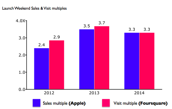 First, using data collected from the Foursquare app, it compared the number of visits to Apple stores during the weeks leading up to the launch day and for the week following the launch. Not surprisingly, when it looked at the data for the last three launches (2012, 2013, and 2014), it found a massive spike in visits on the Friday of the launch.