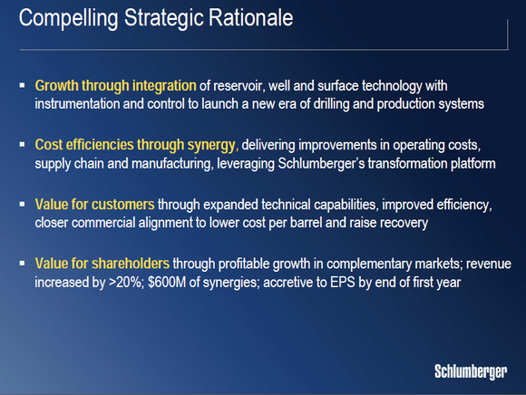 The first three points in the above chart -- growing through integration, cost efficiencies through synergies, and value for customers -- all look compelling and would realistically help Schlumberger drive growth.