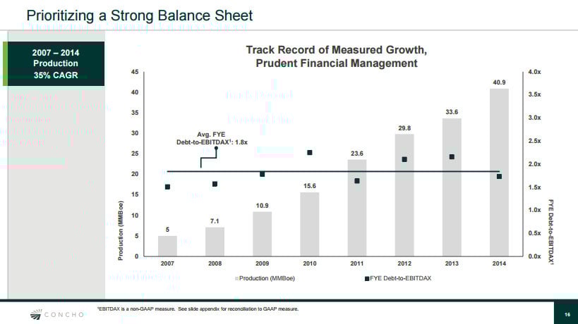 These same two characteristics are also what set Concho Resources apart from most other oil companies. It too has a very compelling resource position covering 700,000 net acres in the Permian Basin, underneath which the company estimates lies 3.7 billion barrels of oil equivalent. It's a strong resource base that the company has used to fuel its 35% compound annual production growth rate from 2007 to 2014.
