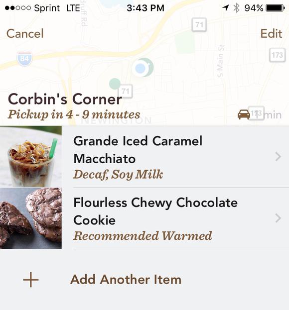 It actually took a little less time than the completion screen said it would and the counter person let me know by name (which must have been provided by the app). Everything was correct and delivered quickly with no problems. I repeated the experience the next day in the same store with the same result during a very crowded, line-out-the-door morning rush. (The app also stores recent orders, so if you get the same thing regularly, you won't have to customize it each time).
