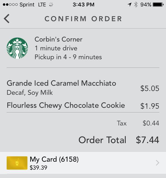 Once my order was finalized, I was shown the price and given a chance to confirm it. That screen, as you can see on the right also told me when I would be able to pick it up at the counter and how far away I was from the store. After confirming the order, I was brought to a screen where I could view the receipt and tip the baristas -- exactly what happens after paying at the counter via the app in the traditional fashion.